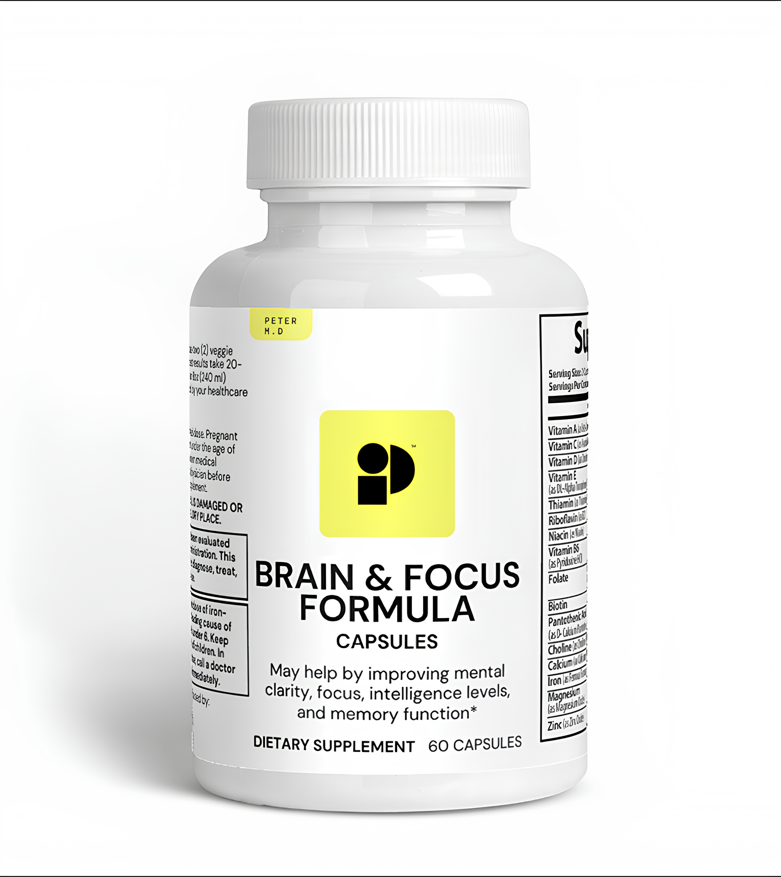 Ingredients: Vitamin A (as Beta-Carotene), Vitamin C (as Ascorbic Acid), Calcium (as Calcium Carbonate), Iron (as Ferrous Fumarate), Vitamin D (as Cholecalciferol), Vitamin E (as DL-Alpha-Tocopheryl-acetate), Vitamin B1 (as Thiamine Mononitrate), Vitamin B2 (as Riboflavin), Vitamin B3 (as Niacin), Vitamin B6 (as Pyridoxine HCL), Folate, Biotin, Vitamin B5 (as D-Calcium Pantothenate), Magnesium (as Magnesium Oxide), Zinc (as Zinc Oxide), Selenium (Selenium Amino Acid Chelate), Copper (as Copper Gluconate), Manganese (as Manganese Amino Acid Chelate), Chromium (as Chromium Picolinate), Molybdenum, Potassium (as Potassium Citrate), Choline (as Choline Bitartrate), Proprietary Blend (DMAE Bitartrate, L-Glutamine HCL, Glutamic Acid, Green Tea Extract, Bacopa Extract, Inositol, N-Acetyl L-Tyrosine, Bilberry Fruit Extract, GABA, Grape Seed Extract, Grapefruit Seed Extract, Olive Leaf, Cinnamon Bark Extract, Licorice Root Extract, Boron, DHA 14%, Vanadyl, Phosphatidylserine, Huperzine A, Hypromellose (vegetable capsule), Rice Flour, Magnesium Stearate, Silicon Dioxide.